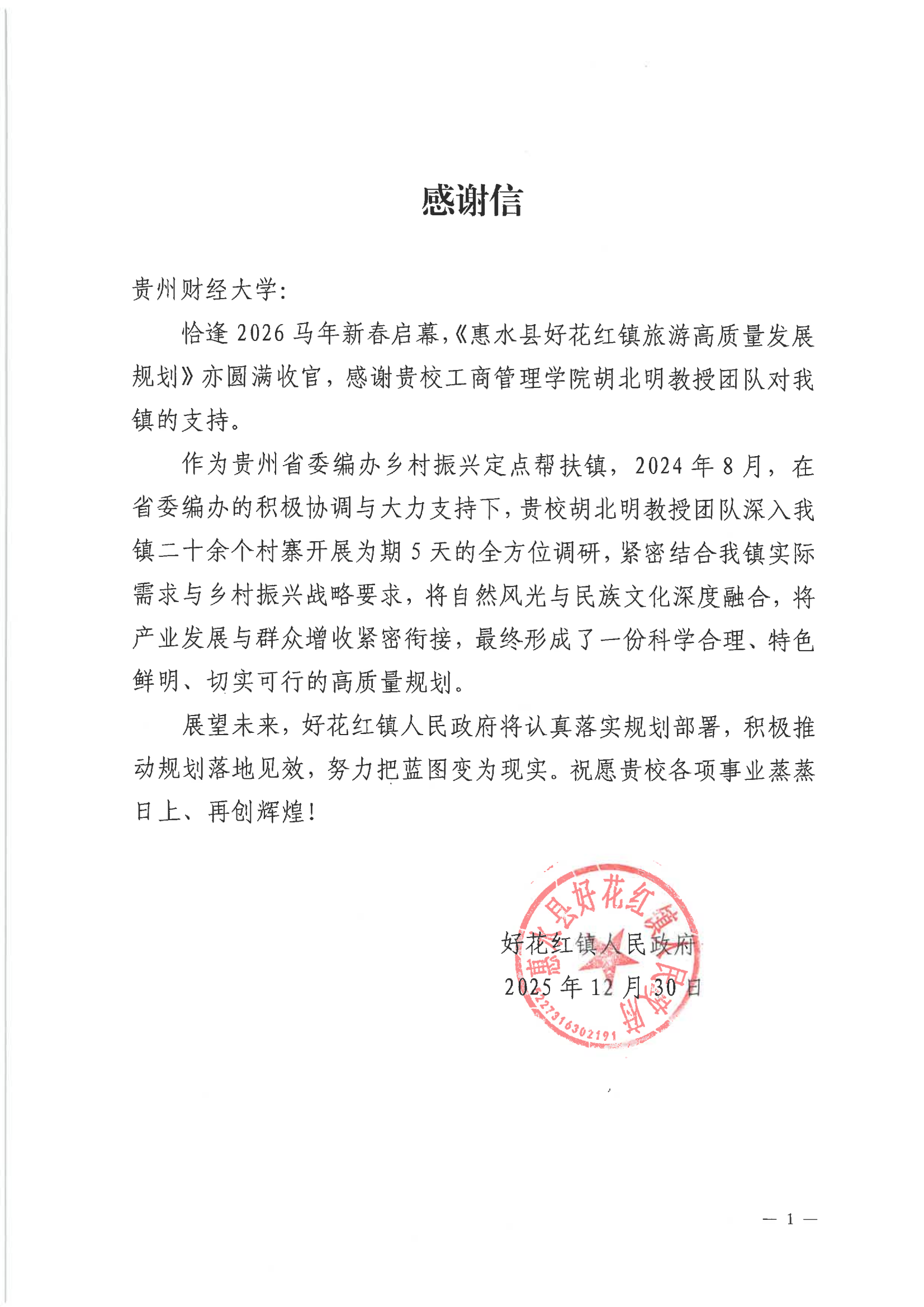 近日,我们收到惠水县好花红镇人民政府发来的感谢信,对402cc永利官网胡北明教授团队圆满完成《惠水县好花红镇旅游高质量发展规划》编制工作给予高度认可,对我们助力乡村振兴的责任担当深表谢意。